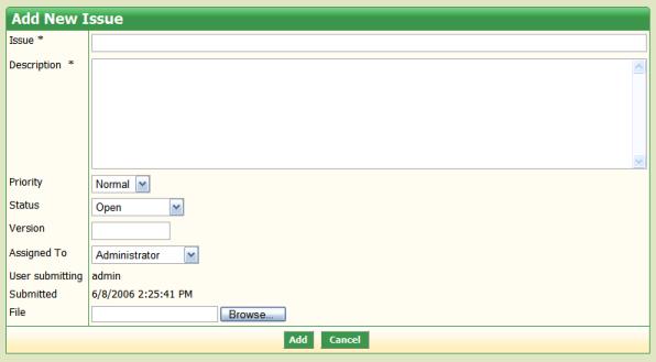 After clicking clicking the link Add New Issue form is displayed where the user enters Issue name, Description and selects various parameters regarding the issue, such as Priority and Status, Version of a product issue is concerned with as well as the user that will be Assigned To the issue.