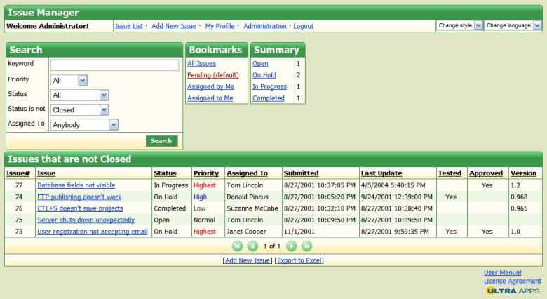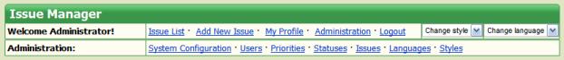 Version 3.0 of IssueManager brings multiple translations and visual styles selection. Switching both of those is possible selecting values from application header's listboxes (to the right). Those listboxes contain items that can be administered via Languages and Styles pages of Administration section.