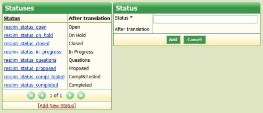 Statuses administrative section works in a similar manner. Status form works in insert mode by default. Clicking value from Statuses grid brings Status form into edit mode where changes can be saved using Submit button. Returning to insert mode is possible then clicking Add New Status link or Cancel button.