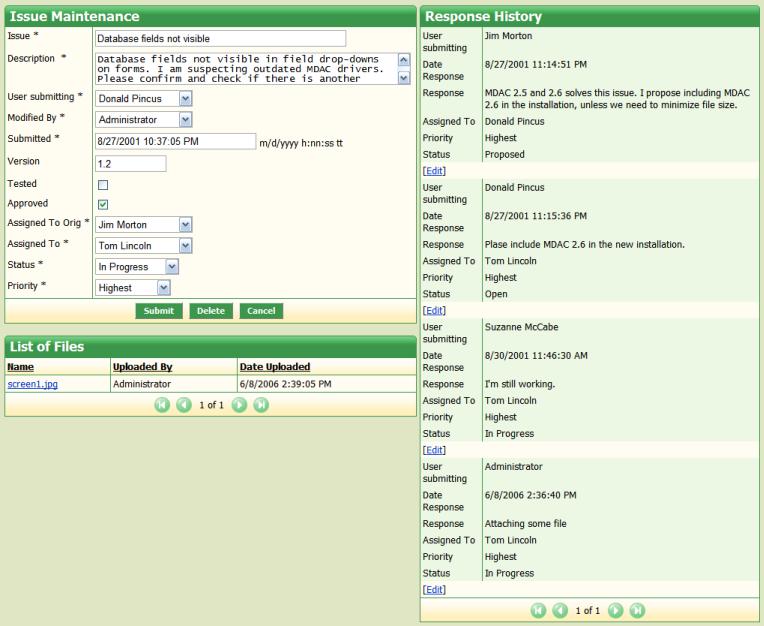 Issue Management page also lists issue's file attachments in the List of Files grid (sortable, paginable. Clicking file name link in this grid navigates to the File Maintenance page described below.