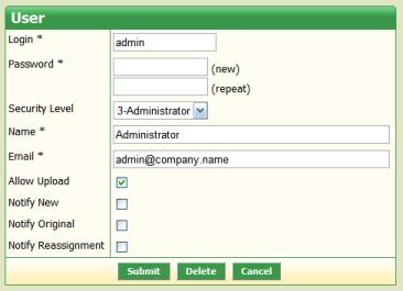 Clicking user's name navigates to the User details form. Administrator may configure user's login here, change password, select another security level, provide name and email and configure several boolean flags allowing user to upload and receive different types of notifications.