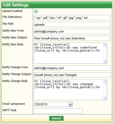 Edit Settings form contains various configuration settings that customize how the application acts mainly in terms of attachment uploads and mailing. Each configuration setting is described in a table below: