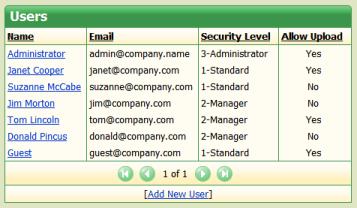 Users grid lists user's Name column, Email, Security level and Allow Upload flag. The grid offers common sorting feature (clicking column caption text) and paginating (using navigator in the bottom).