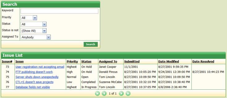 The main view of Issues Management section presents Search form similar to the one located on the main page and issues grid listing issues matching search criteria (keyword, priority, status, not status and assigned user).