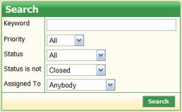 The Issues List by default presents list of all issues that are not Closed. IssueManager users may customize and filter grid contents using wide range of criteria. Filtering uses the Search form displayed above the grid. The form contains the following fields: Keyword for specifying text to match against issue name and description (only issues containing specified keyword in issue name or description are listed), Priority (only issues with selected priority are listed), Status (only issues with specified status are listed), Status is not (only issues with any status except selected are listed) and Assigned To (only issues assigned to specified user are listed).