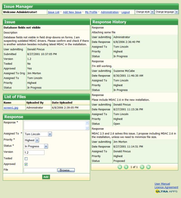 IssueManager's Administration section contains Issues link which contains management section for issues, attachments and responses. The overall layout of the section is similar to the one used on Issues List, Issue Details and Response form, but Administrators in this section have more options modifying record values.