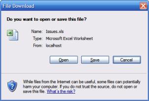 To download export file user needs to click Export to Excel link available below Issues List grid (close to Add New Issue link). After clicking the link file download is detected by your browser and you user is able to save .xls file for opening with Microsoft Excel.