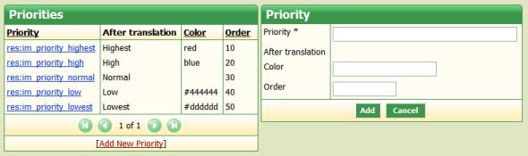 Priorities grid lists all available priorities on both translated and untranslated form along with color and order specified for each item. Clicking priority caption link brings Priority form into edit mode with Submit button to apply changes. Add New Priority link in the grid's bottom (or clicking Cancel in the form) turns Priority form back to insert mode.