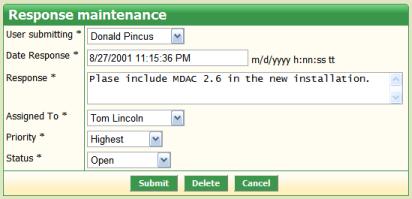 Response maintenance form displays for editing fields of selected response. Responses are always child records to some issue, submitting new response modifies some of the attributes of the parent issue. Maintenance form contains fields for choosing submitter and assigned users as well as response date. Other fields include response status and priority and textual response description. As always Submit button saves changes made, Cancel returns to the parent issue details and Delete button deletes response record from database.