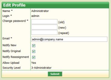 Each logged in user may access several personalization options accessing My Profile link in the application header menu. Using Edit Profile form user may change own password for authentication (providing old password and new password repeated). Other options available configure user mailing settings: email address to send user's notifications to and 3 checkboxes to define which notification types will be sent to the current user (notification about being assigned new issue, about reassigning issue submitted by the user originally and about losing issue assignment).